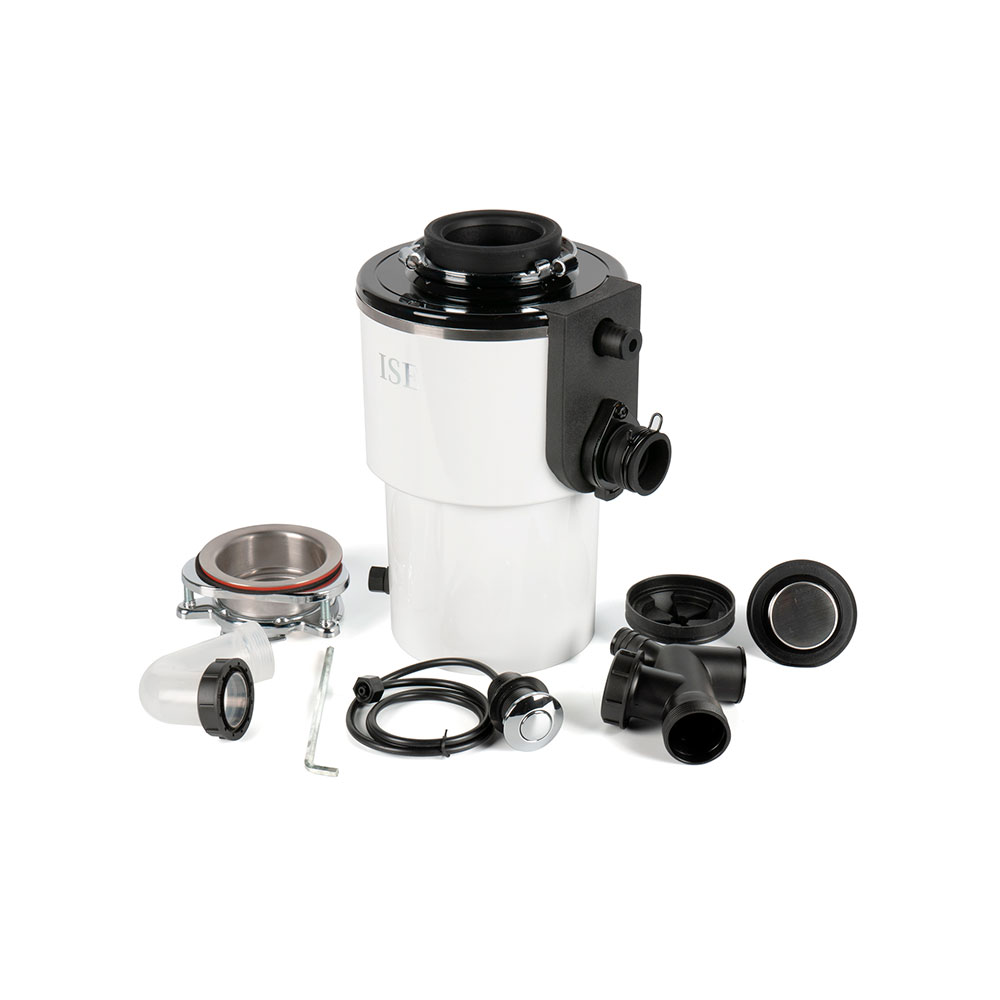 Измельчитель пищевых отходов со встроенным блоком пневмопуска, встраиваемая кнопка пневмовыключателя, заглушка-толкатель, фланец в сборе, брызгозаградительное кольцо, выпускное колено с отводом для посудомоечной машины, кабель 1 м с вилкой, инструкция.