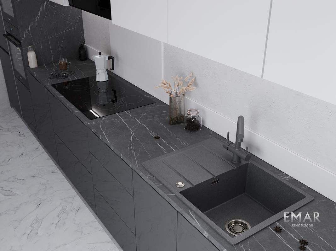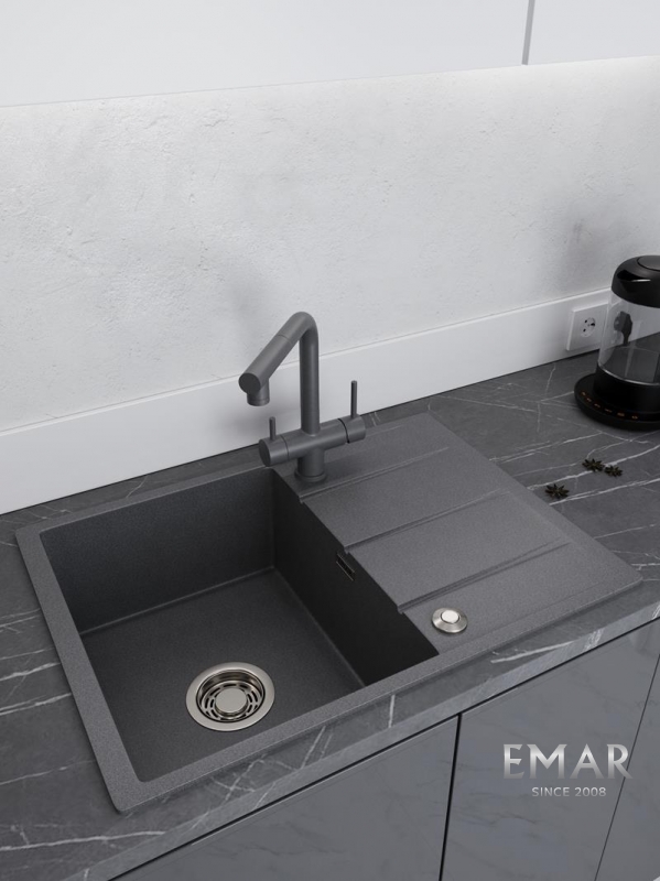 Кухонные мойки EMAR QUARTZ на 78% состоят из измельченного кварца различных фракций и 22% связующих полиэфирных смол. Дополнительные связующие компоненты образуют антибактериальную защиту. Бесшумные, практичны в уходе и удобны в эксплуатации.