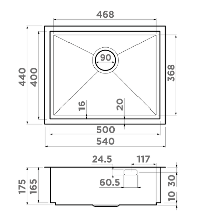 Kasen 54-16 – увеличенная мойка, которая подходит для изделий с материалом, толщиной 12 мм (компакт, акриловый камень весь, кварц, керамика).