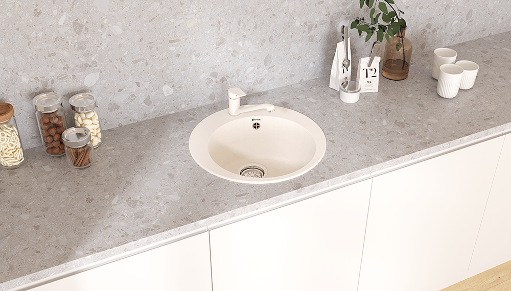 Материал мойки представляет из себя искусственный камень, который является композитом на основе натурального мрамора и связующих смол. Искусственный камень существенно снижает уровень шума при падении струи воды. Специальное покрытие гелькоут защищает поверхность мойки от загрязнений и бытовых царапин, делая уход за мойкой легким и простым.