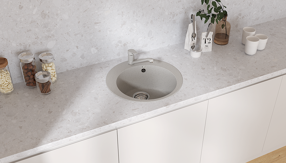 Материал мойки представляет из себя искусственный камень, который является композитом на основе натурального мрамора и связующих смол. Искусственный камень существенно снижает уровень шума при падении струи воды. Специальное покрытие гелькоут защищает поверхность мойки от загрязнений и бытовых царапин, делая уход за мойкой легким и простым.