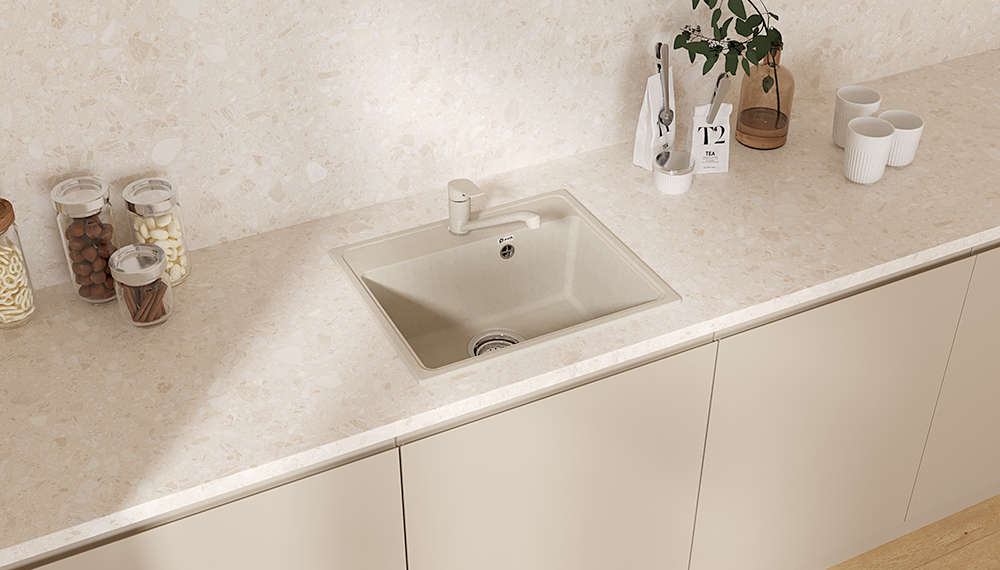 Материал мойки представляет из себя искусственный камень, который является композитом на основе натурального мрамора и связующих смол. Искусственный камень существенно снижает уровень шума при падении струи воды. Специальное покрытие гелькоут защищает поверхность мойки от загрязнений и бытовых царапин, делая уход за мойкой легким и простым.