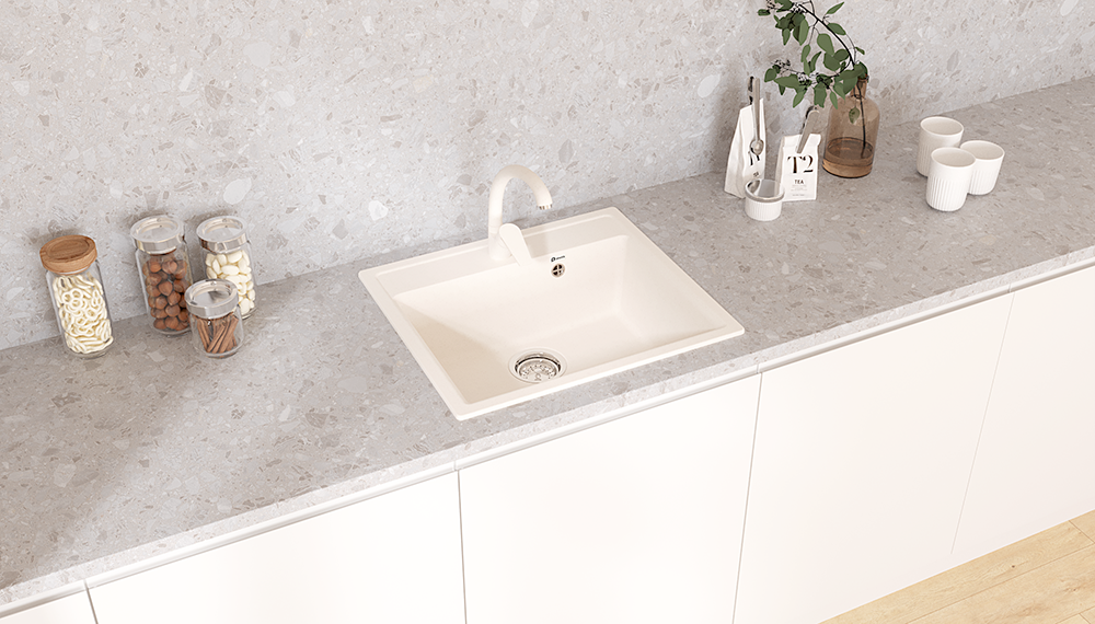 Материал мойки представляет из себя искусственный камень, который является композитом на основе натурального мрамора и связующих смол. Искусственный камень существенно снижает уровень шума при падении струи воды. Специальное покрытие гелькоут защищает поверхность мойки от загрязнений и бытовых царапин, делая уход за мойкой легким и простым.