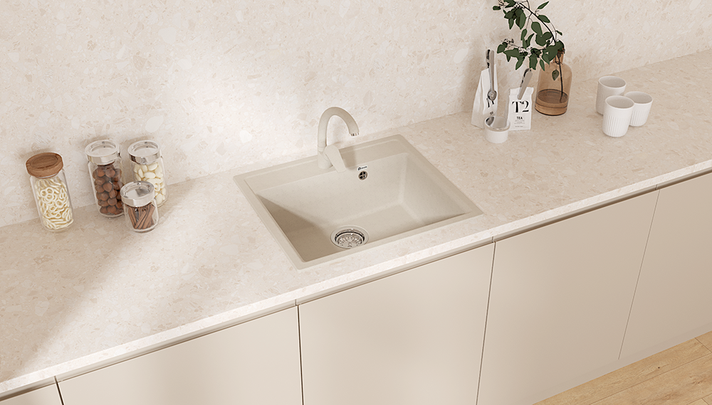 Материал мойки представляет из себя искусственный камень, который является композитом на основе натурального мрамора и связующих смол. Искусственный камень существенно снижает уровень шума при падении струи воды. Специальное покрытие гелькоут защищает поверхность мойки от загрязнений и бытовых царапин, делая уход за мойкой легким и простым.