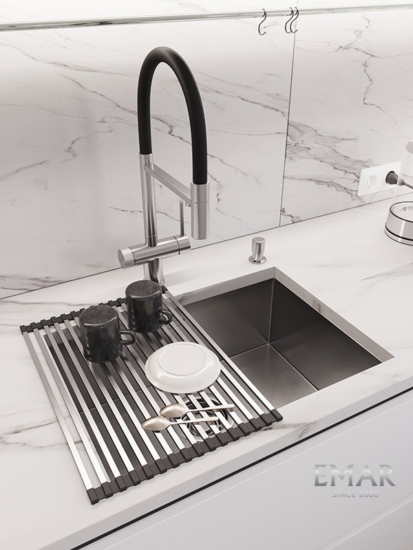 Стильные коврики «Ролл-мат» расстилаются на кухонных мойках или на столешнице. Используют для сушки овощей, посуды, а также для размещения горячих кастрюль и сковородок.