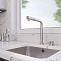 Выдвижной излив увеличивает площадь и эффективность использования смесителя. Однорычажное управление поможет легко регулировать температуру и напор подачи воды. Соответствует стандартам DIN DVGW.