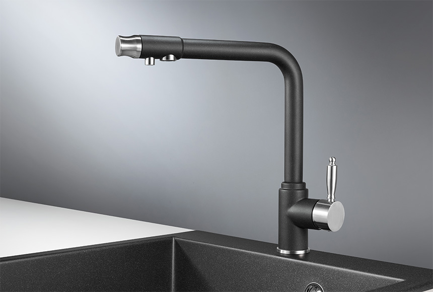 Смеситель для кухонной мойки Granula 2301 изготовлен из высококачественного инновационного материала. Корпус из нержавеющей стали обеспечивает длительный срок службы. При этом высокий излив позволяет мыть как мелкую, так и крупногабаритную посуду. Модель смесителя Granula 2301 выполнена с краном для питьевой воды. Особенность смесителя Granula 2301, то что переключатель на фильтрованную воду находится на изливе смесителя, это удобно и практично. Фильтрованная вода подается по отдельной трубке и не смешивается с водопроводной водой. Покупателям предлагаются различные типы смесителей, окрашенные в тон моек Granula и StandART.