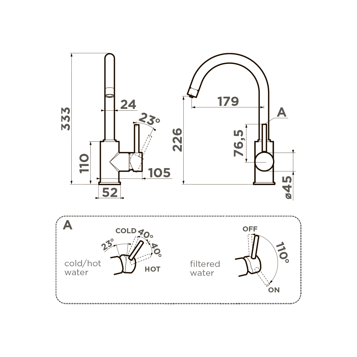 Omoikiri Shinagawa 2 Plus-BL - современный кухонный смеситель, изготовленный с применением новой технологии системы ручки 3в1 - MULTI. Инновация технологии позволяет управлять горячей, холодной и фильтрованной водой одним рычагом (более подробно смотрите на схеме). Фильтрованная вода подается по отдельной трубке и не смешивается с водопроводной водой. Смеситель обладает высоким арочным изливом, обеспечивающим удобное наполнение габаритной посуды (кастрюли, вазы). Модель изготовлена из высококачественной латуни. Окраска поверхности под цвет каменных моек Omoikiri.
