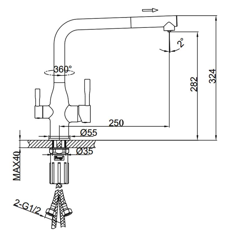 Переходник (F34304) и гибкая подводка (F95-4 или F95-5, F95-6, F95-8, F95-10, F95-12, F95-15, F95-20) для крана под фильтр у данного смесителя в комплекте не идут!